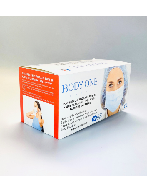 In Stock Accessoire Masques chirurgicaux Type IIR fabriqué en France, lot de 22 Boites de 50 pièces BODY ONE Type IIR fabriqués en France: personnalisé €6.90 Add to cart