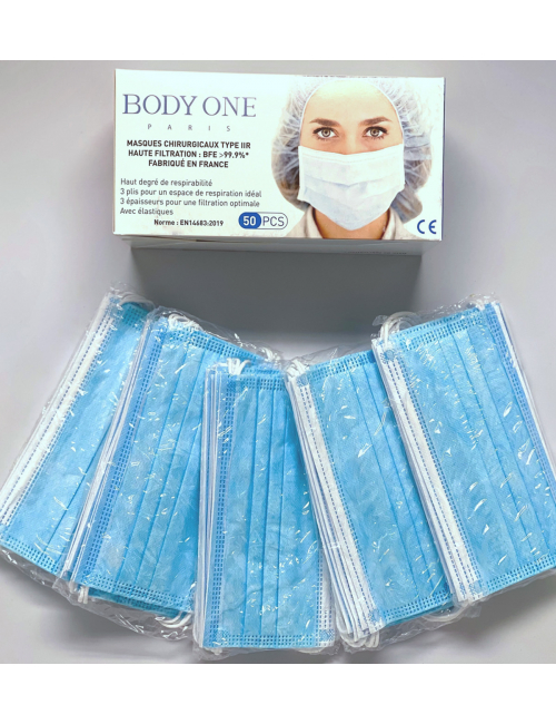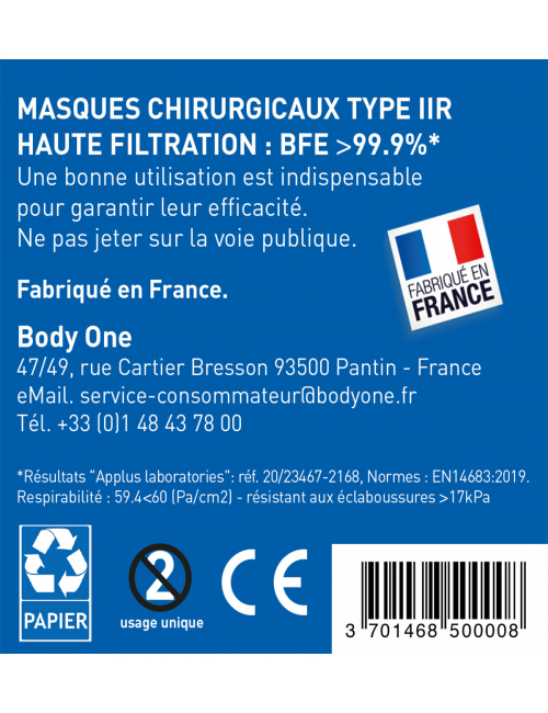 In Stock Accessoire Masques chirurgicaux Type IIR fabriqué en France, lot de 22 Boites de 50 pièces BODY ONE Type IIR fabriqués en France: personnalisé €6.90 Add to cart