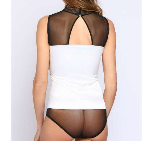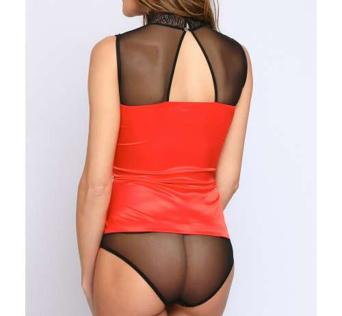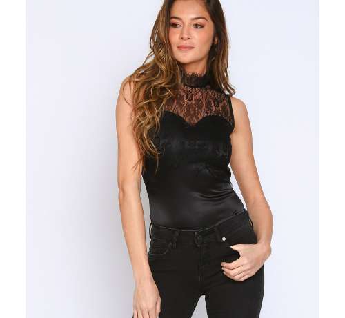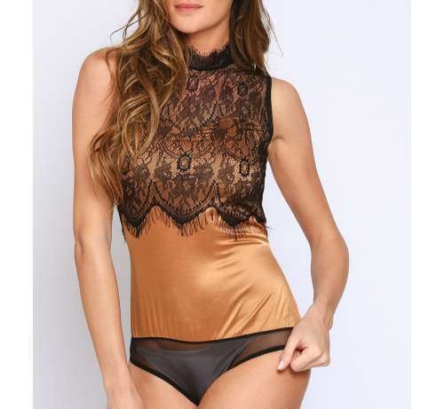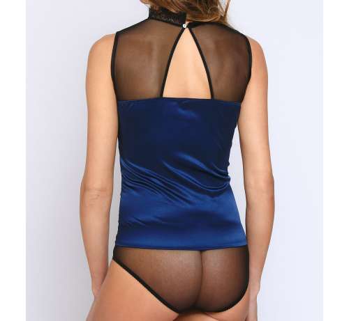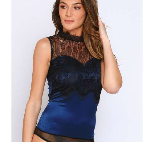 Ce body chic est en tissu satin principalement, surmonté d'une dentelle incluant le col ras du cou. La fermeture dans le dos avec un bouton nacre. La culotte taille basse permet un meilleur maintient sous les vêtements, elle est en résille elasthanne noir non transparent. Il est conseillé jusqu'au Bonnet C
