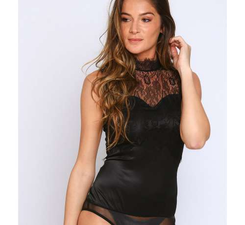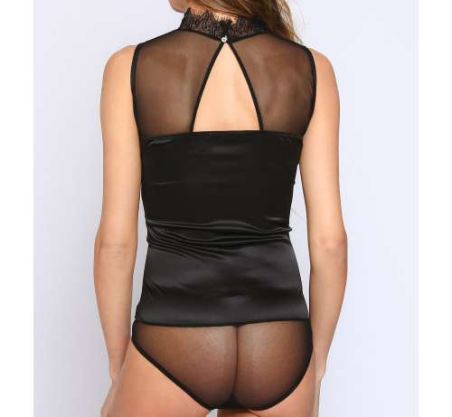 Body satin et dentelle ouvert dans le dos.Ce body chic est en tissu satin principalement, surmonté d'une dentelle incluant le col ras du cou. La fermeture dans le dos avec un bouton nacre. La culotte taille basse permet un meilleur maintient sous les vêtements, elle est en résille elasthanne noir non transparent.
