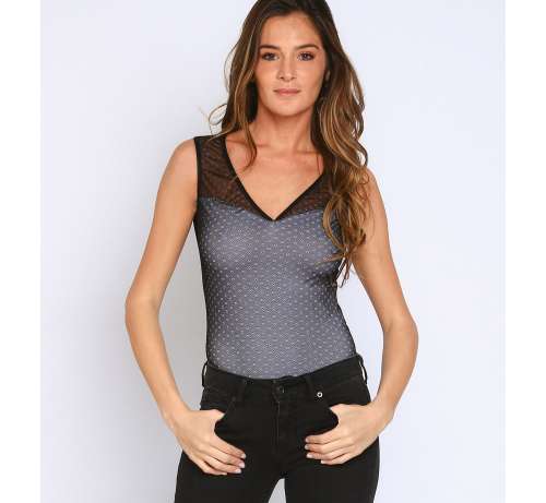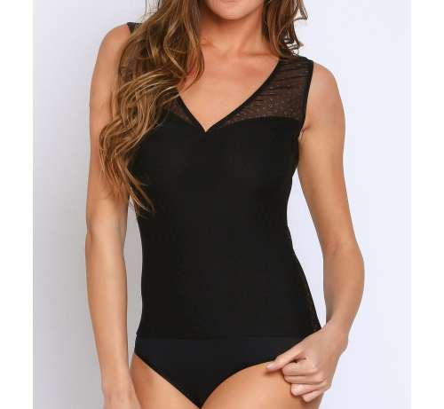Ce body débardeur en dentelle noire fleurie doublée en polyamide non transparent. Modèle facile a porter tout les jours ou en soirée