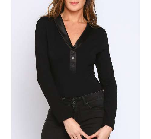 C’est un Body en bambou élasthane très agréable à porter. Très élègant avec son col smoking en satin.