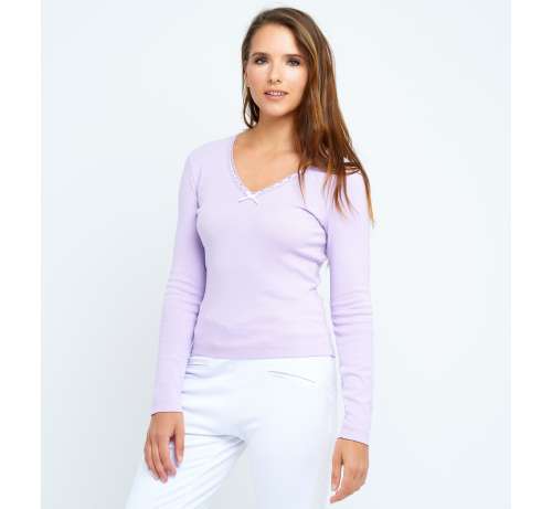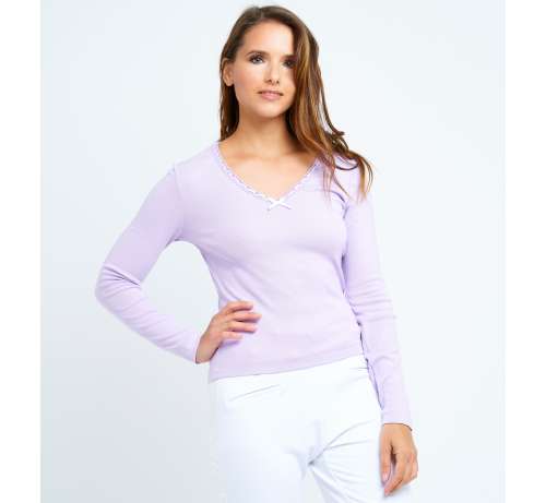 T-shirt manches longues en 100% coton couleur lilas, col avec son passe ruban satin et son petit nœud au décolleté. Très agréable au touché et à porter pour vos nuit tendres.