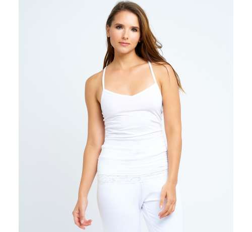 Top bretelles blanc dentelle dos, aves sa bande dentelle en lurex gris sur le bas du top
