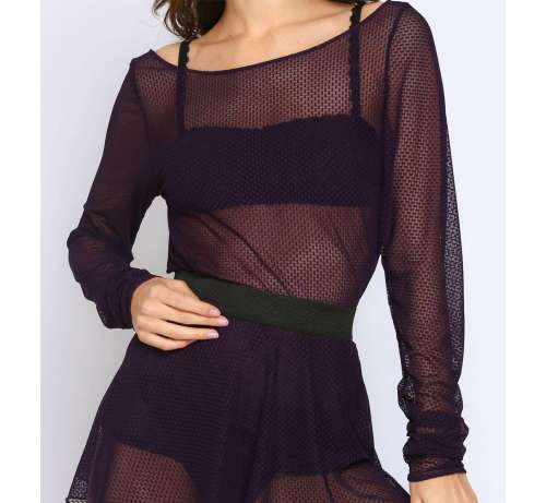Sublime top manche longue froncée en bas de manche en résille motif pied de poule. Au dos, une profonde encolure en V et réhaussée d'un joli noeud noir, vient mettre en valeur votre dos. Des fronces au dos donnent une touche sensuel.