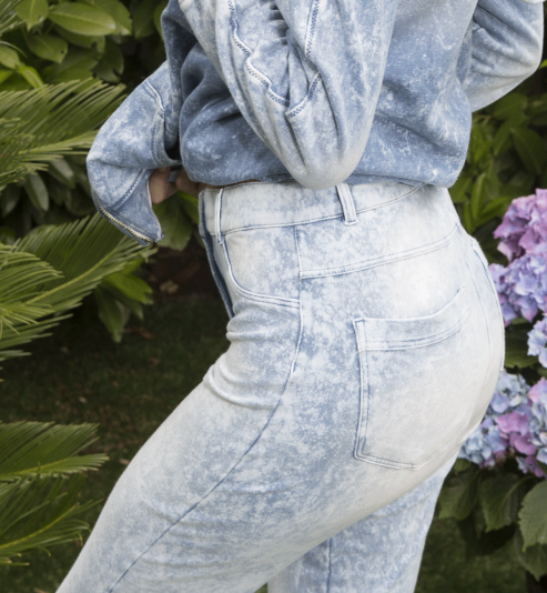 Pantalon Jegging délavé avec son style jean, ses poches arrières et ses fausses poches avant.