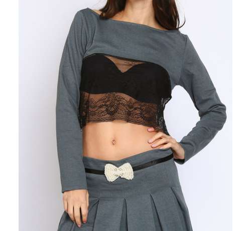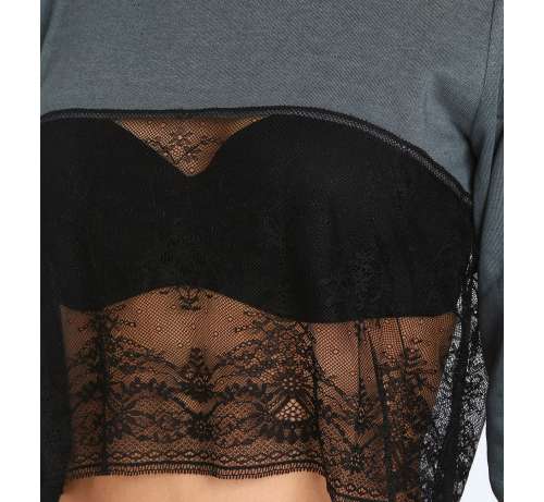 C'est un modèle col rond et manche longue en molleton léger comme un sweat. Le bas du crop top est en dentelle noire. Vous pouvez également compléter la tenue pour composer l'ensemble avec la mini jupe crop molleton et dentelle.
