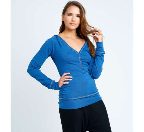 T-Shirt long Coton col V avec sa boutonnière et sa capuche, fil lurex argent tout du long.